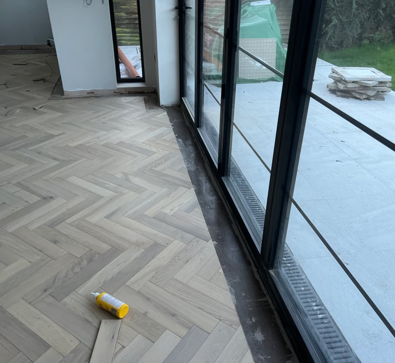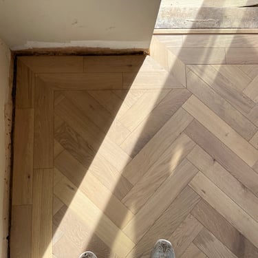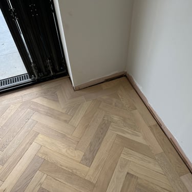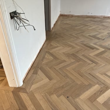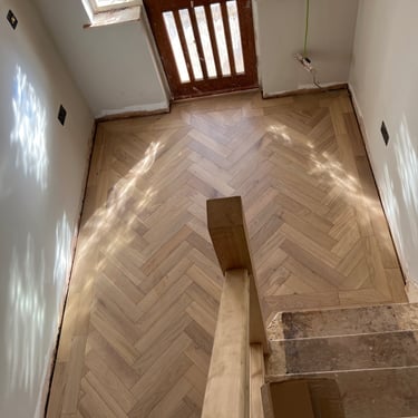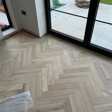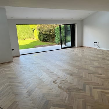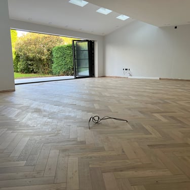 Our team was commissioned to install a herringbone floor with a border, a classic layout known for its visual sophistication and complexity. The flooring was supplied by us but made by Ted Todd, a leading name in sustainably sourced, high-quality timber flooring.