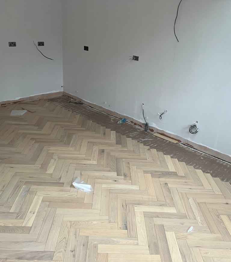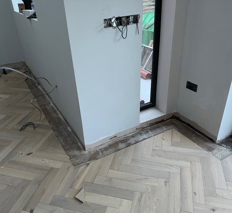 To frame the herringbone and add an extra touch of elegance, we crafted a bespoke border around the perimeter of the room. This involved: