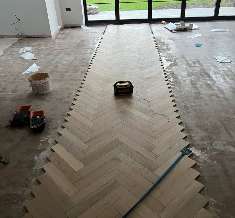 With the floor prepped, we established a crown row – the central starting line from which the herringbone pattern radiates. Getting this row perfectly straight is vital, as it defines the symmetry of the entire layout.